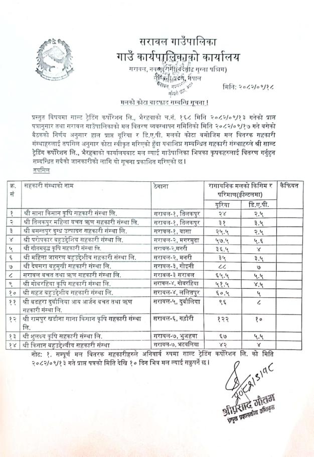 मलको कोटा बाँडफाँड सम्बन्धि सूचना !!