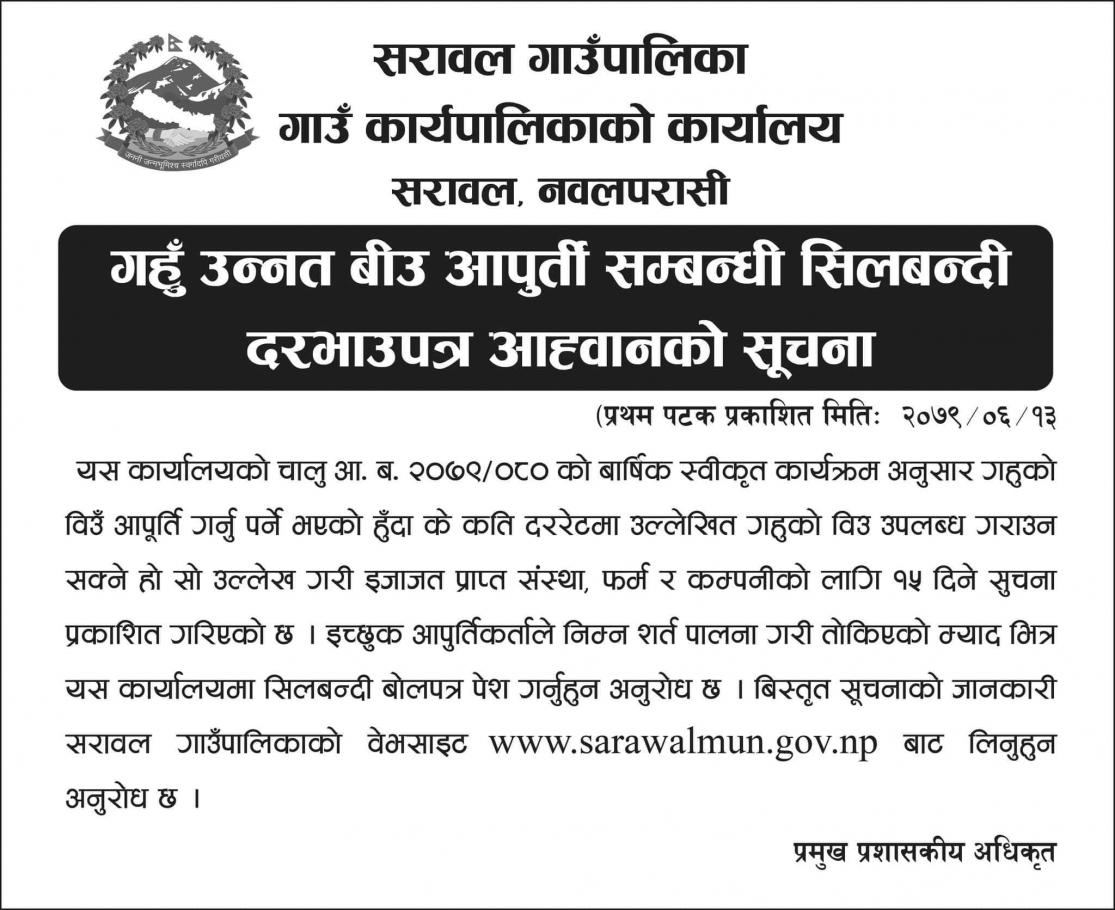 गाहुँ उन्नत बिउ आपुर्ति सम्बन्धी सिलबन्दी दरभाउपत्र अह्वानको सूचना !!