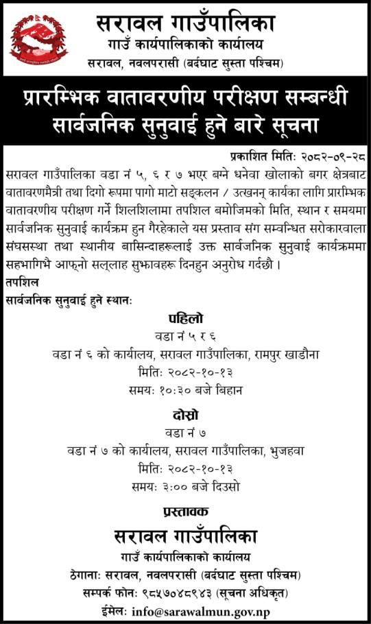 प्रारम्भिक वातावरणीय परीक्षण सम्बन्धी सार्वजनिक सुनुवाई हुने बारे सूचना ।
