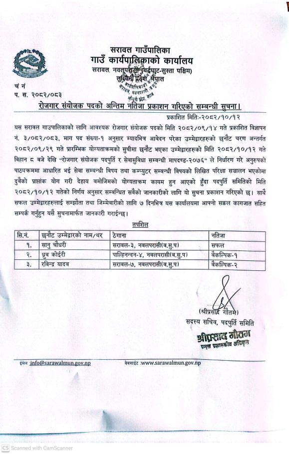 रोजगार संयोजक पदको अन्तिम नतिजा प्रकाशन गरिएको सम्बन्धी सुचना