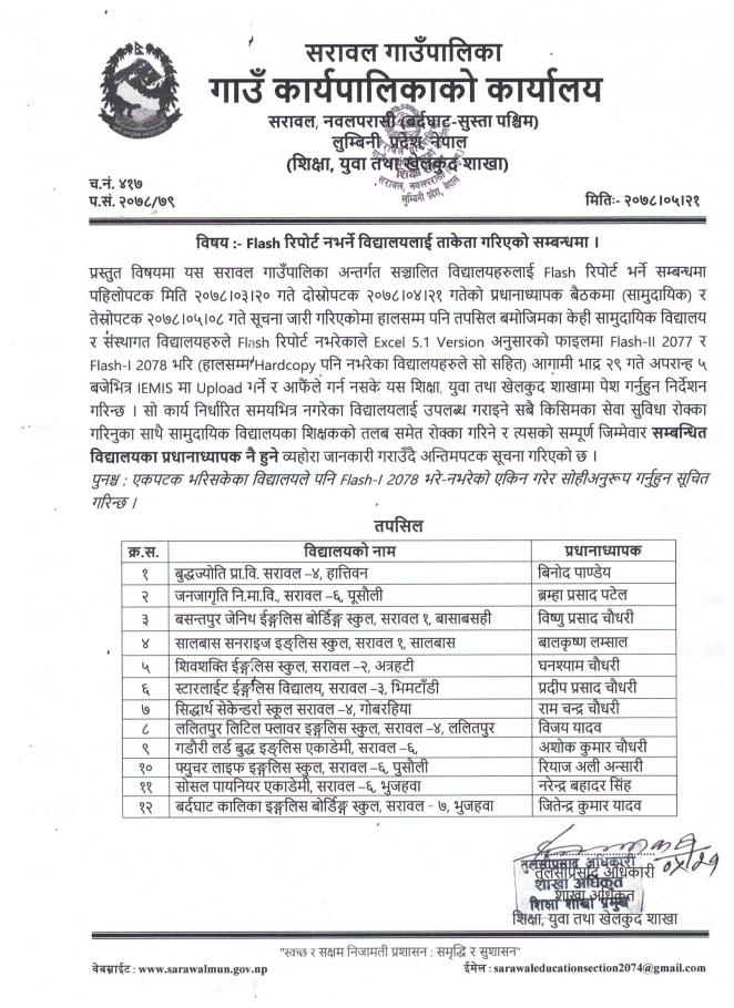 » Flash रिपोर्ट नभर्ने विद्यालयलाई ताकेता गरिएको सम्बन्धमा !!!